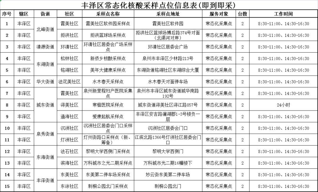 为深入贯彻落实党中央、国务院决策部署,落实十条优化措施,丰泽区结合实际,自12月10日开始调整优化核酸采样点(采样点明细及服务时间附后),确有需求的居民请就近、错峰选择点位进行采样。感谢您对丰泽区疫情防控工作的支持!
