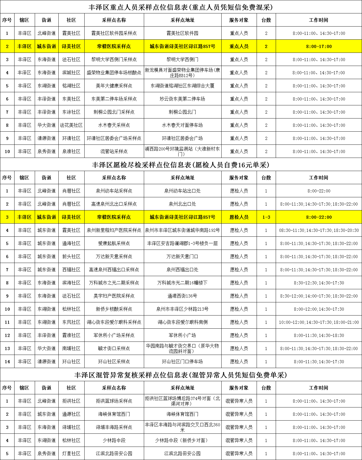 为确保采样安全、有序进行,尽量满足群众的需求,12月16日起,丰泽区动态调整部分采样点工作时间,详见核酸采样点信息表。请居民朋友关注采样时间,错峰就近前往。