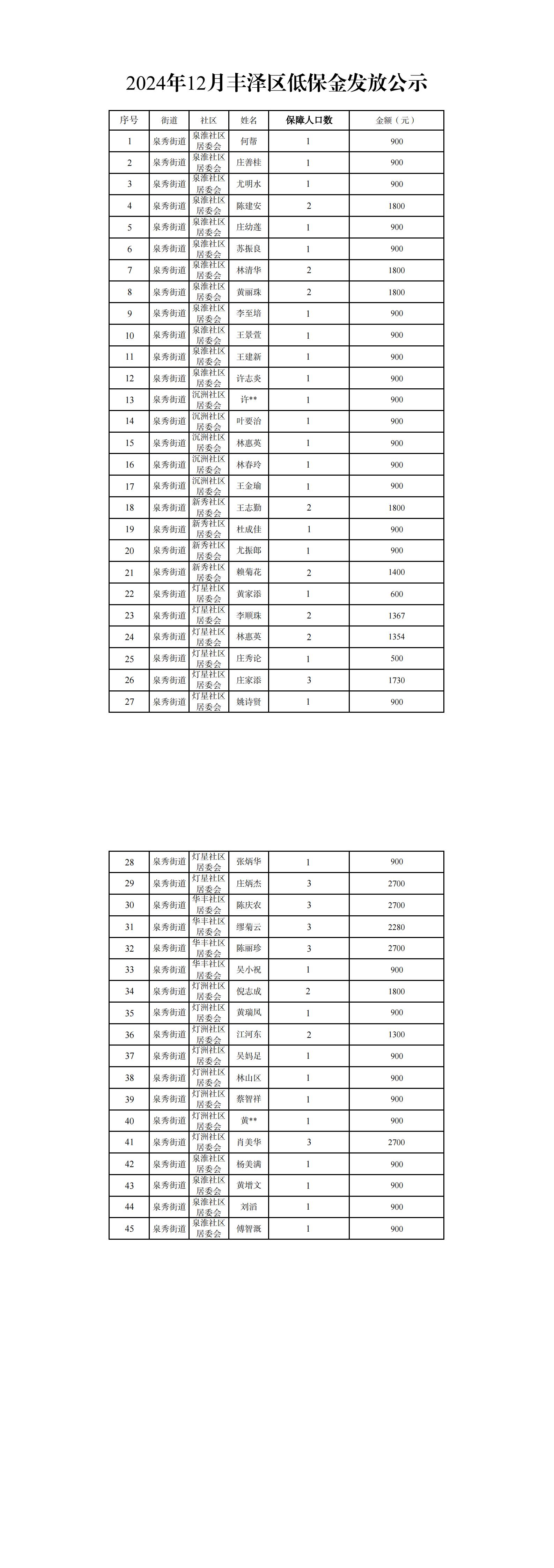 2024年12月丰泽区低保金发放公示(泉秀街道)
