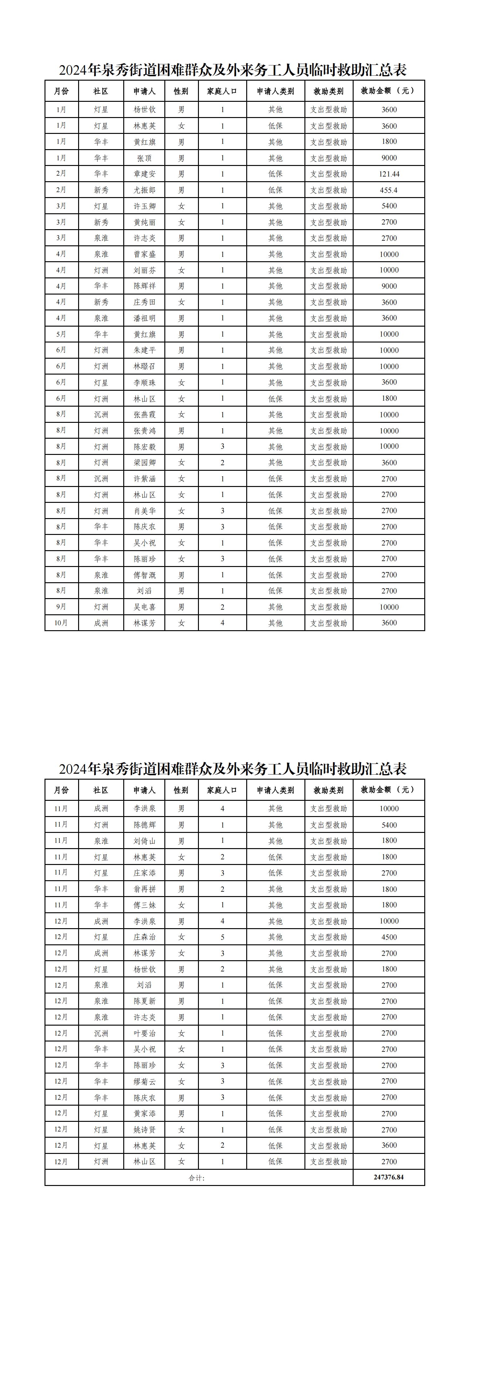 2024年泉秀街道困难群众及外来务工人员临时救助汇总表