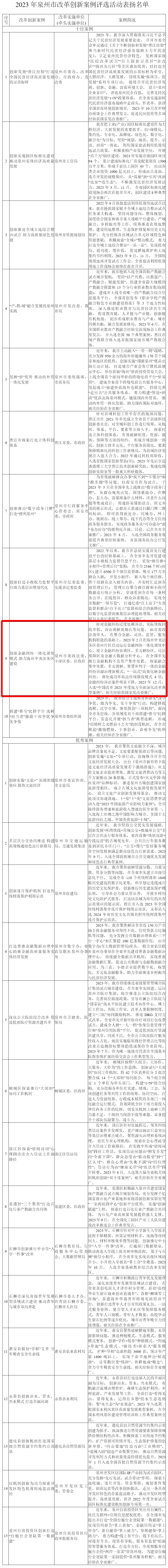 泉州是全国18个改革开放典型地区之一,近年来先后获批民营经济综合改革、自主创新示范、盘活利用低效用地、产融合作、产教融合、知识产权强市建设、社会信用体系建设示范等国家级改革试点。全市各级各部门深入贯彻落实中央、省委和市委深改委系列决策部署,用好改革“关键一招”,扎实推进各项改革任务落地见效,涌现出一大批获得上级肯定、具有泉州特色、实现创新突破的改革成果和案例。